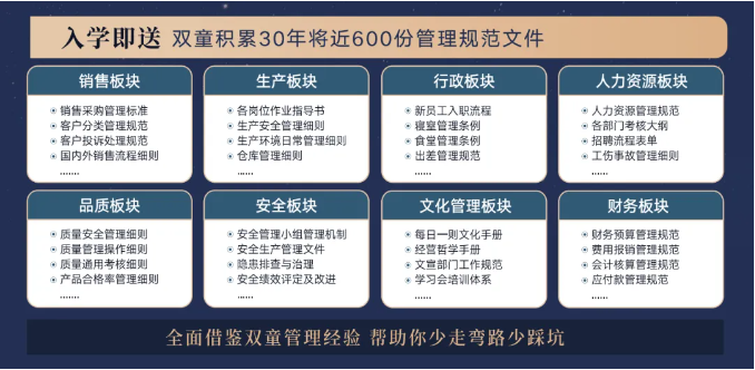 所以,入學“隱形冠軍樓仲平思享薈”之后,項目組會將“雙童”積累了30年、包含了銷售、生產(chǎn)、行政、人類資源、品質、安全和文化管理7大板塊,將近600分管理規(guī)范文件,全部打包給學員,幫助學員企業(yè)能夠全面借鑒雙童管理經(jīng)驗、少走彎路、少踩坑!