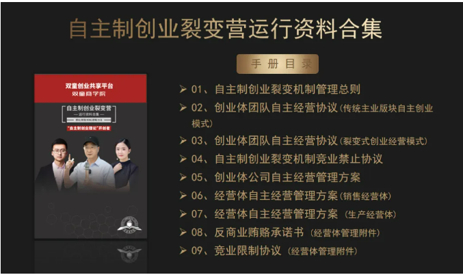3、交付自主制創(chuàng)業(yè)裂變模式的各項(xiàng)規(guī)則、文本、合同等書面資料