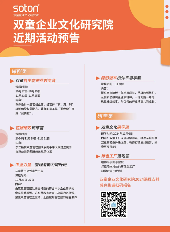 如果你也對“雙童”充滿好奇,也想全面了解“雙童”的企業(yè)文化、經(jīng)營理念、精細化管理,通過系統(tǒng)的課程深入地探索、學習“雙童”成為行業(yè)“隱形冠軍”的底層邏輯,從而賦能自己的企業(yè),歡迎咨詢報名“雙童”課程!