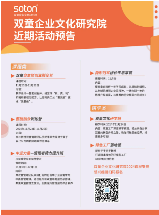 如果你也對(duì)“雙童”充滿好奇,也想賦能團(tuán)隊(duì)共同成長(zhǎng),歡迎走進(jìn)11月24日【雙童文化研學(xué)班】,與上百位優(yōu)秀的創(chuàng)業(yè)者一起學(xué)習(xí)!少量名額,歡迎咨詢鎖定!