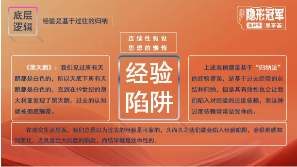 所以樓老師在課上,選用經(jīng)典的“黑天鵝”和“感恩節(jié)的火雞”作為教學(xué)案例,讓同學(xué)們明確認(rèn)識(shí)到:經(jīng)驗(yàn)的底層邏輯是基于過往的歸納,但世界是“非連續(xù)性”的,對(duì)過去的歸納總結(jié)對(duì)未來(lái)未必有效,想象力需要反叛精神。