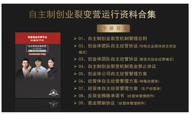 3)組織治理模塊:《自主制創(chuàng)業(yè)裂變營》專注于組織機制創(chuàng)新,幫助學員輸出一套企業(yè)組織創(chuàng)新方案,激發(fā)個體活力,推動企業(yè)裂變式增長。