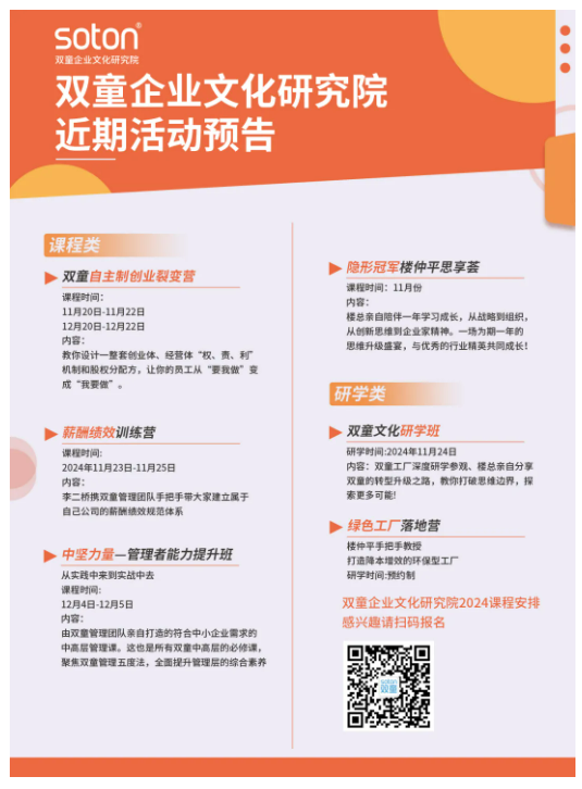 4)領袖智慧模塊:《隱形冠軍樓仲平思享薈》通過樓仲平老師的全年深度教學及雙童“中國式管理體系”輸出,致力于培養(yǎng)更多中國隱形冠軍企業(yè),實現(xiàn)企業(yè)家的認知升級、實戰(zhàn)落地。