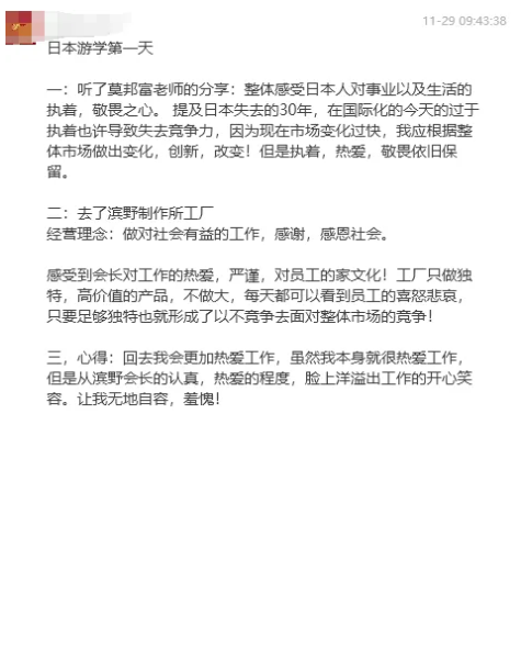 所以浜野慶一會(huì)長(zhǎng)特別提出了這樣的經(jīng)營(yíng)理念:“常懷 ‘款待之心’,感恩回報(bào)顧客、員工和當(dāng)?shù)兀蔀橐患矣袎?mèng)想,有自我,有前途,打造充滿(mǎn)自豪感與活力的企業(yè)!”。