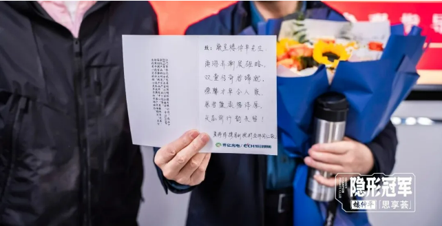 創(chuàng)始人夏濤濤夫婦不僅給樓仲平老師獻(xiàn)上鮮花以表敬意,更是特意手寫了一首原創(chuàng)詩(shī),“商海弄潮展雄略,雙童傳奇君締就,德馨才卓令人崇,愿君康泰福澤厚,矢志前行韻長(zhǎng)留!”表達(dá)了對(duì)樓仲平老師的敬仰與祝福。