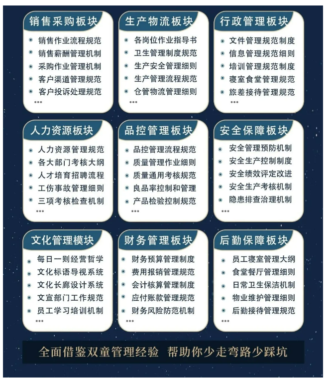 所以,入學(xué)“隱形冠軍樓仲平思享薈”之后,項(xiàng)目組會(huì)將“雙童”積累了30年、包含了銷售、生產(chǎn)、行政、人力資源、品控、安全、文化管理、財(cái)務(wù)和后勤等9大板塊,近600份管理規(guī)范文件,全部打包給學(xué)員,幫助學(xué)員企業(yè)能夠全面借鑒雙童管理經(jīng)驗(yàn)、少走彎路、少踩坑!