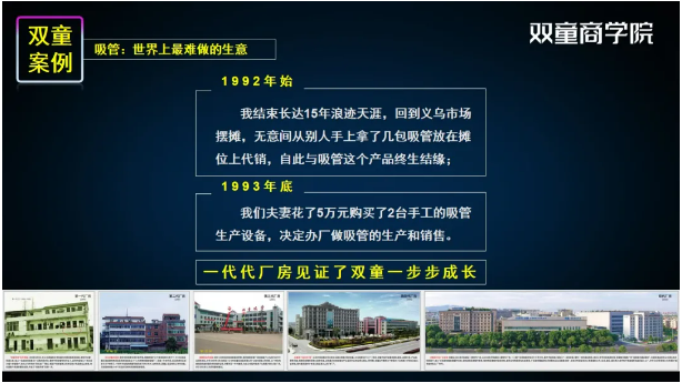 此后不到六年,雙童創(chuàng)業(yè)平臺(tái)成功孵化出了16家創(chuàng)業(yè)體和26個(gè)經(jīng)營(yíng)體,并創(chuàng)造了3.6倍的業(yè)績(jī)?cè)鲩L(zhǎng)!形成了以吸管制造業(yè)為基礎(chǔ),以國(guó)際貿(mào)易和創(chuàng)業(yè)教育兩大板塊為融合的新型產(chǎn)業(yè)模式,完成了從“一根吸管”到“創(chuàng)業(yè)平臺(tái)”的轉(zhuǎn)變!