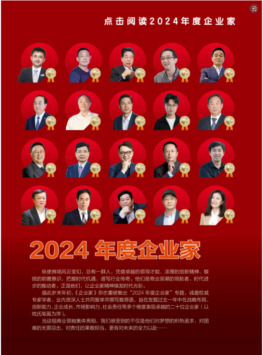 好事成雙!2025年伊始,雙童創(chuàng)始人樓仲平不僅與李彥宏、周鴻祎、曹德旺等20位商界領(lǐng)袖一同被評為“2024年度企業(yè)家”,更是憑借自己曲折傳奇的創(chuàng)業(yè)故事和“創(chuàng)新、冒險、擔(dān)當(dāng)”的企業(yè)家精神,當(dāng)選為《企業(yè)家》雜志封面人物,成為首位登上該刊物封面的中小企業(yè)創(chuàng)始人。