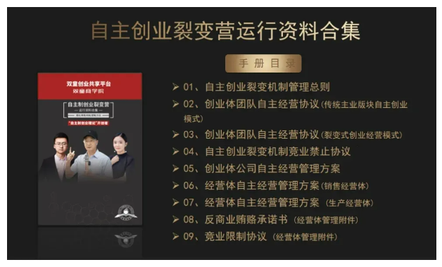 3、交付自主創(chuàng)業(yè)裂變模式的各項(xiàng)規(guī)則、文本、合同等書面資料