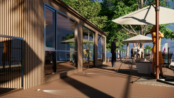 結(jié)合周圍的樹(shù)林環(huán)境,雙童森林長(zhǎng)廊的主體采用了木質(zhì)材料;而考慮到現(xiàn)在年輕人的喜好,又在樹(shù)屋里設(shè)計(jì)了咖啡屋和燒烤區(qū)。