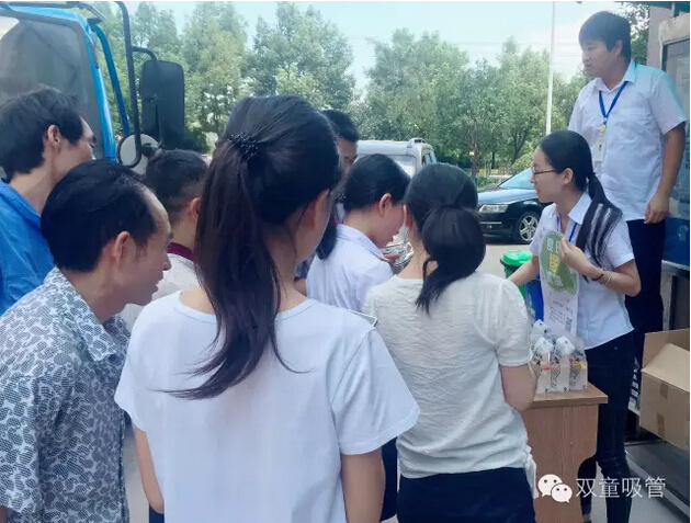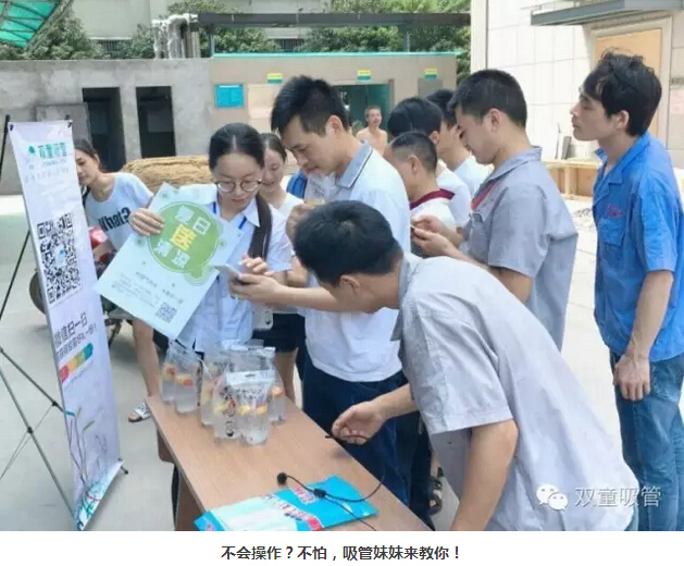 瞧!我們剛開張,就吸引了不少正要去吃飯的員工們。原來,拿到飲料的方法特別簡單,只需要關(guān)注“雙童吸管”的微信公眾平臺并轉(zhuǎn)發(fā)微信,即可獲得檸檬氣泡水一袋呢!看來吸管妞為了微信的推廣也是絞盡腦汁啦!