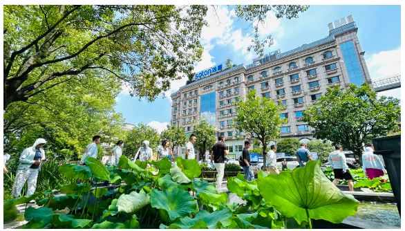 夏天的傍晚,員工們?nèi)齼沙扇郝綐蚺?,沉醉荷池美景。聽瀑布潺潺,看斜陽映水,魚兒游弋,簡直美得像一幅畫~
