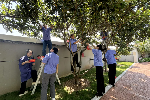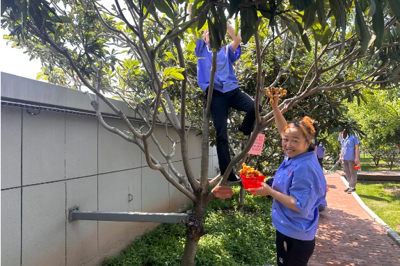 初夏的微風(fēng)輕撫綠葉,蟬鳴聲聲叩響盛夏序章,雙童屋頂生態(tài)園迎來了一年中最甜蜜的時(shí)刻——20多棵枇杷樹掛滿金果,沉甸甸的枝頭仿佛在向每一位雙童人招手!