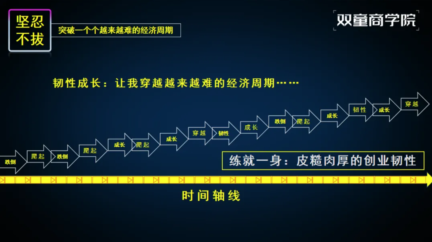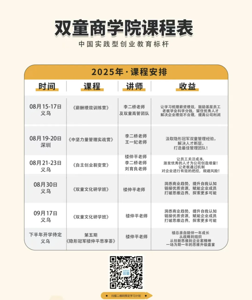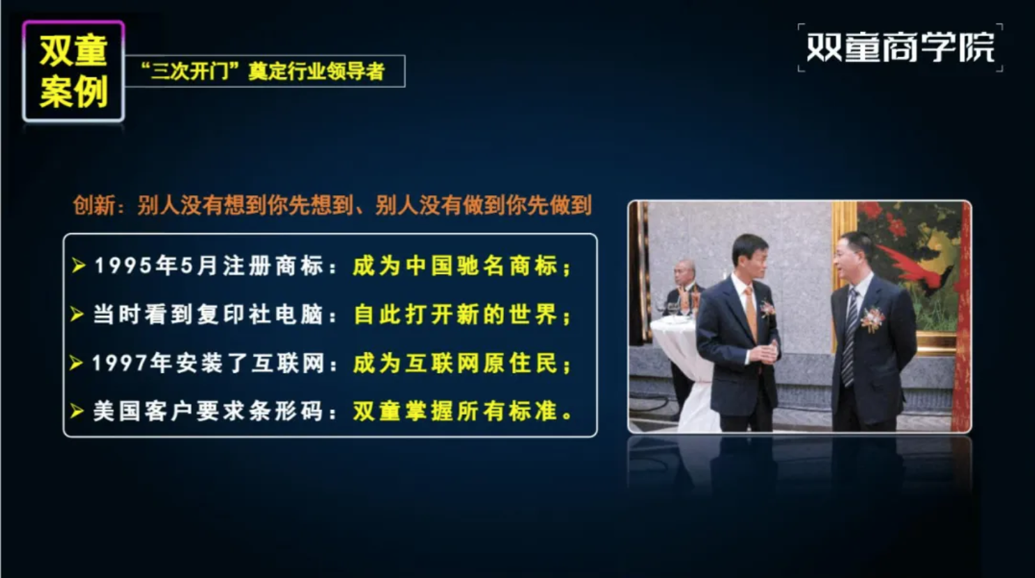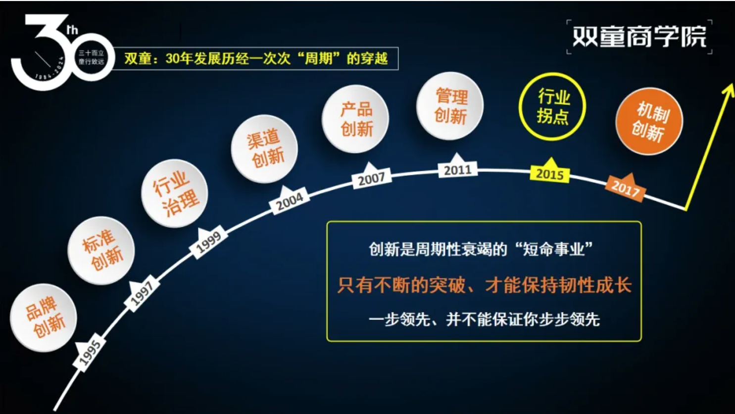 企業(yè)成長的背后是創(chuàng)業(yè)者的持續(xù)成長,“雙童”能夠一次次成功穿越周期的背后,是創(chuàng)始人樓仲平個人的持續(xù)成長、自我進(jìn)化的結(jié)果!也是創(chuàng)始人樓仲平47年如一日踐行"行知合一"的原因。所以在每一場分享中,他都將自己從草根創(chuàng)業(yè)者到行業(yè)領(lǐng)袖的進(jìn)化歷程作為開篇,因?yàn)檫@正是“雙童”韌性成長的核心密碼。