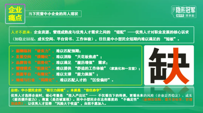 李老師首先拋出一個根本性問題:什么是人才?他指出,真正的人才,是能夠持續(xù)創(chuàng)造價值的人。他進一步分析了當前民營中小企業(yè)面臨的核心用人困境:人才難以吸引、來了難以發(fā)揮作用。