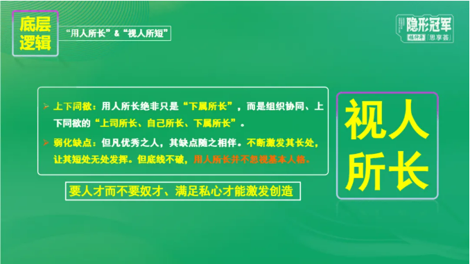 雙童提倡“用人所長,容人所短”。真正的“用人所長”是上下同欲的協(xié)同,需結(jié)合上司、自身和下屬三方所長,形成合力。對于優(yōu)秀人才,應(yīng)充分發(fā)揮其長處,弱化無關(guān)緊要的缺點,但堅守底線不容突破。
