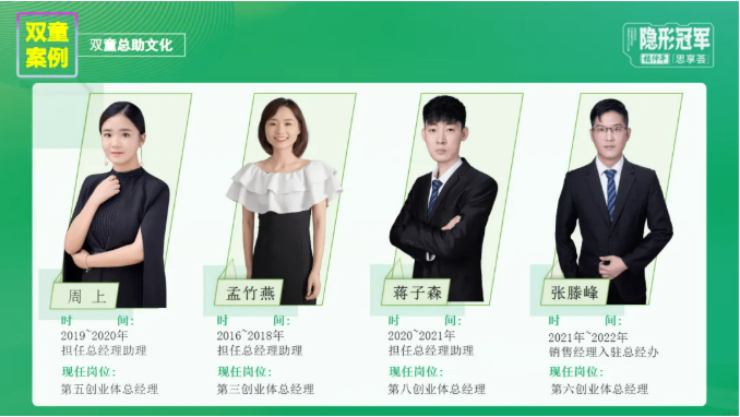 此外,雙童推行的“助理文化”也為人才內(nèi)部成長提供了清晰路徑。例如,第五創(chuàng)業(yè)體負責人周上、第三創(chuàng)業(yè)體負責人孟竹燕、第八創(chuàng)業(yè)體負責人蔣子森等人,均是從助理崗位起步,通過系統(tǒng)培養(yǎng)和實戰(zhàn)歷練逐步晉升至部門負責人,這也充分體現(xiàn)了雙童在人才梯隊建設(shè)與機制賦能上的顯著成效。