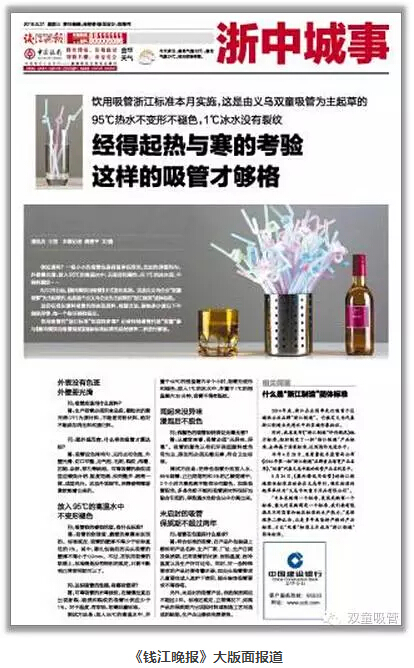 8月26日,由“雙童”主導(dǎo)起草的“浙江制造”團(tuán)體標(biāo)準(zhǔn)《聚丙烯飲用吸管》正式發(fā)布實(shí)施!這份標(biāo)準(zhǔn)從塑料吸管的形態(tài)到原料、檢測方法、耐熱多少度以下不能變形等,每一個(gè)細(xì)節(jié)都有明確的規(guī)定。消息一出,引起了新聞媒體的高度關(guān)注。這不,浙江的權(quán)威媒體《錢江晚報(bào)》對此也進(jìn)行了大版面報(bào)道,下面妞就帶大家來看看吧!