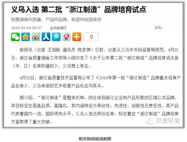 今年4月28日,省質(zhì)量技術(shù)監(jiān)督局公布《2016年第一批“浙江制造”品牌重點(diǎn)培育產(chǎn)品名單》,“雙童”代表義烏申報(bào)的吸管產(chǎn)品名列其中。