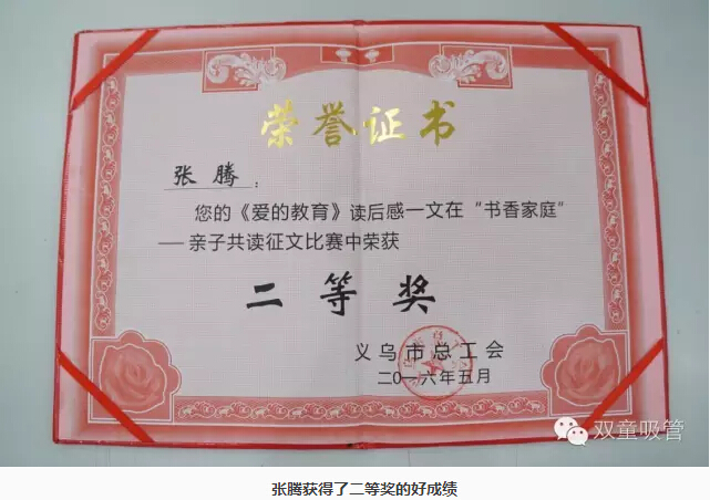 今年上半年,義烏總工會組織了一次“書香家庭”——親子共讀活動。聽說有這樣的活動,“雙童”的寶貝們也想去試試。這不,我們生產(chǎn)廠長李秀前和后勤主管張秀真的兒子張騰在和媽媽一起親子閱讀了《愛的教育》之后,寫了一篇讀后感,參加了此次比賽。沒過多久,義烏總工會就傳來消息,這篇讀后感在征文比賽中獲得了義烏地區(qū)二等獎的好成績!張騰小朋友不僅有大大的紅包獎勵,還有獲獎證書哦!