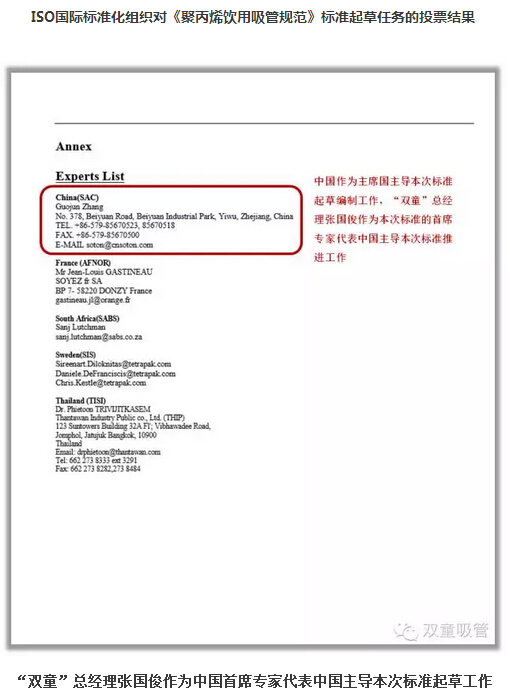 2016年6月27日,瑞士ISO標準化管理組織正式向全球162個成員國下發(fā)了《聚丙烯飲用吸管規(guī)范》ISO國際標準文本。至此,歷經(jīng)九年,輾轉(zhuǎn)六國,由“雙童”代表中國主持起草的《聚丙烯飲用吸管規(guī)范》ISO國際標準終于大功告成!標準起草編制工作圓滿完成。