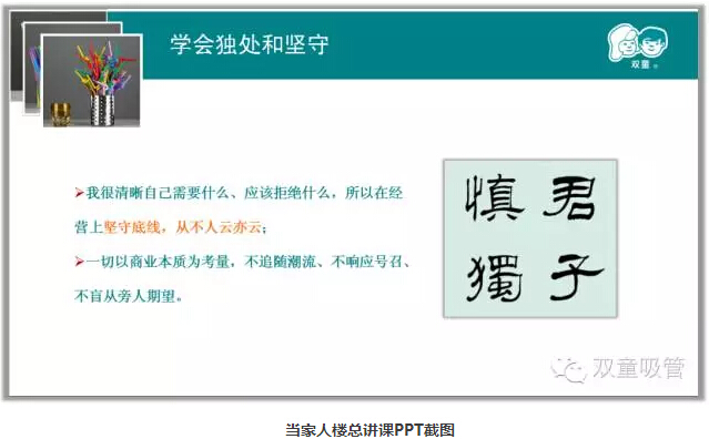 由此可見(jiàn),盲目地交朋友,拉關(guān)系只會(huì)導(dǎo)致自己越來(lái)越累,最后還是不能把事情做好。當(dāng)家人樓總曾經(jīng)在他的課件里這樣說(shuō),我很清晰自己需要什么,應(yīng)該拒絕什么,所以在經(jīng)營(yíng)上堅(jiān)守底線,從不人云亦云,不追隨潮流,不響應(yīng)號(hào)召、不盲從旁人期望。