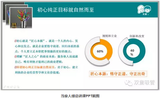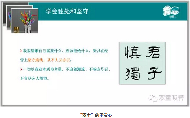 “恒心”是用長(zhǎng)遠(yuǎn)的眼光去看問(wèn)題,我們強(qiáng)調(diào)戰(zhàn)略思考、戰(zhàn)略規(guī)劃、戰(zhàn)略部署,唯獨(dú)缺少戰(zhàn)略耐心。“雙童”堅(jiān)持小客戶原則,堅(jiān)持對(duì)員工投入,堅(jiān)持走差異化的道路,“雙童”的發(fā)展也越來(lái)越好。創(chuàng)新就是改變,就是持續(xù)積累。創(chuàng)新需要戰(zhàn)略耐心,需要十年為一個(gè)單位的恒心。