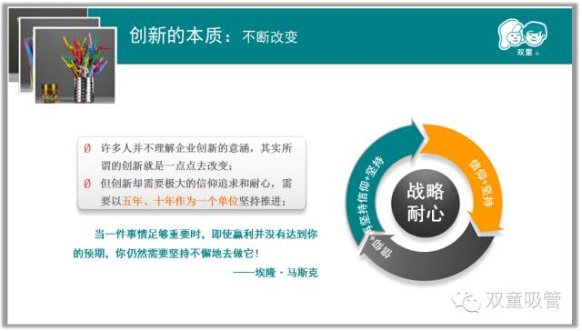 首先,當(dāng)家人樓總分享了自己30多年的創(chuàng)業(yè)經(jīng)歷,在不斷失敗的教訓(xùn)中,他選擇了把一根吸管做精、做細!通過二十多年積累,“雙童”初步形成了專注經(jīng)營、創(chuàng)新進取、綠色低碳、和諧共贏和精細化管理的發(fā)展理念,“雙童”也發(fā)展的越來越好!而這些都離不開“匠心”。