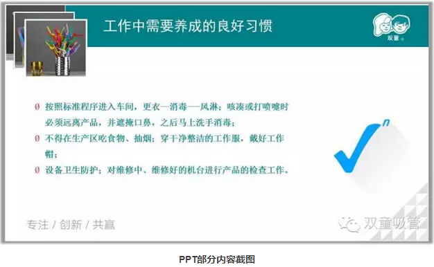 做好衛(wèi)生工作是質量的基礎,衛(wèi)生保障工作已經嚴重影響到企業(yè)的生存和發(fā)展,公司不斷投入對車間硬件進行改造就是為了提升產品的質量,所以,我們自身要養(yǎng)成良好的衛(wèi)生習慣!