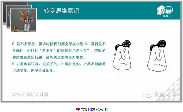 課上,陳講師通過幾個案例向我們說明了一個道理:細節(jié)往往因為“小”,而容易被人忽視,掉以輕心;因其“細”常常使人感到繁瑣。不屑一顧,但就是這些小事和細節(jié),往往就是事物發(fā)展的關鍵,成也細節(jié),敗也細節(jié)!