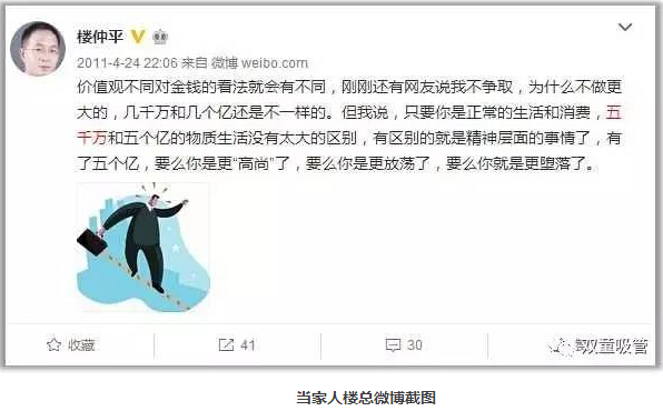 沒錢談不上自由,但有錢也未必自由。原始積累很重要!當家人樓總幾年前發(fā)的一條微博道出了他的看法:價值觀不同對金錢的看法就會有不同,其實只要你是正常的生活和消費,五千萬和五個億的物質(zhì)生活每月不會有太大的區(qū)別,有區(qū)別就是精神層面的事情了,有了五個億,要么你就更“高尚”了,要么你是更放蕩了,要么你就是更墮落了。