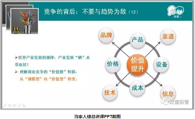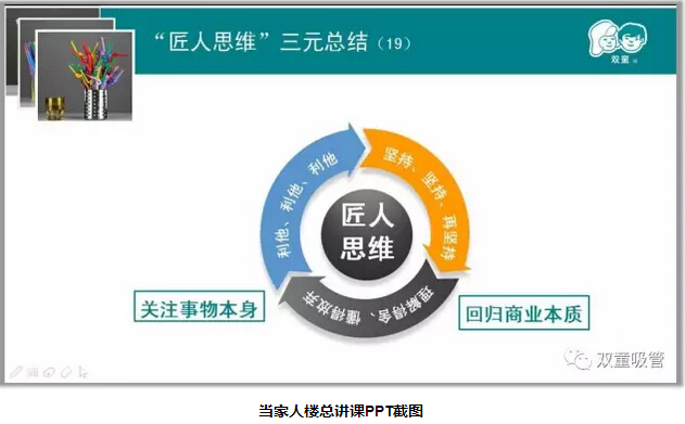 當(dāng)家人樓總圍繞“匠人思維”的商業(yè)本質(zhì)、“競爭”的商業(yè)本質(zhì)兩方面進(jìn)行分享!首先當(dāng)家人樓總講述了他對“匠人思維”的理解,從本質(zhì)上來講“匠人”不只是為他人著想,更不是大公無私,而是基于理性、立足客觀、看的長遠(yuǎn)。只有遵循商業(yè)本質(zhì),凡事長遠(yuǎn)計議,以利他之心去經(jīng)營才能把事業(yè)做好。同時,當(dāng)家人樓總也和大家分享了“雙童”的發(fā)展也一直圍繞著“匠人之心”——“初心”、“恒心”、“平常心”。
