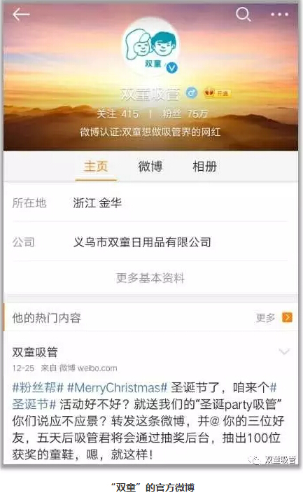 目前,“雙童”的官方微博和官方微信平臺是義烏企業(yè)界公認(rèn)的優(yōu)秀模板之一。通過我們近78萬的官方微博微信平臺的宣傳、企業(yè)官方網(wǎng)站的更新宣傳,使大眾更全面地了解到了“雙童”的企業(yè)文化,加強(qiáng)了與外界的溝通聯(lián)系,帶動了“雙童”文化與品牌的傳播。除此之外,我們也會定期舉辦線上及線下粉絲交流會,和粉絲們一起互動交流!
