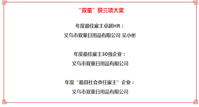 1月10日下午,“我的企業(yè)我的家”2016義烏最佳企業(yè)文化暨“最佳雇主”評選頒獎典禮在義烏工商學(xué)院舉行,近百位企業(yè)負責(zé)人共同見證了義烏新一屆“最佳雇主”的誕生!“雙童”也名列其中,被評為2016中國義烏年度"最佳雇主"及“最具社會責(zé)任雇主”企業(yè),副總吳小彬也被評為年度最佳雇主卓越HR!其實“雙童”一直以來都十分重視員工關(guān)懷,下面妞就帶大家來看看“雙童”是如何做的吧!