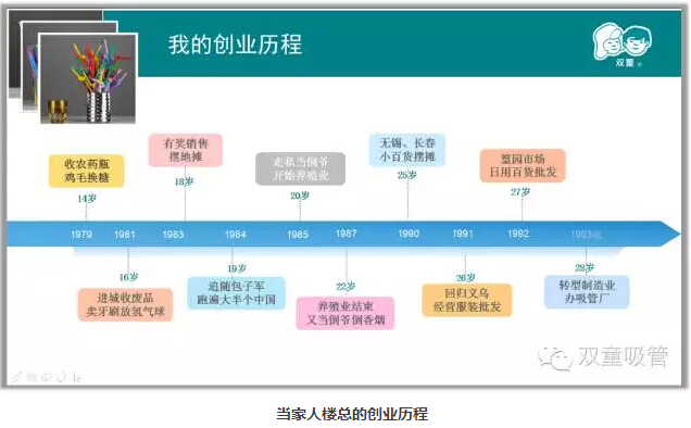 樓仲平開始思考不能只做代銷,要有自己的工廠。他就在村里租了兩間民房辦起了吸管,1995年,樓仲平還給自己的產(chǎn)品注冊了“雙童”商標。1997年,樓仲平結識了一位日本客戶,讓他做生意的理念發(fā)生轉變。他決定改變粗放經(jīng)營的薄利多銷,在企業(yè)管理中追求精益求精。樓仲平說,這個理念應該就是現(xiàn)在說的“工匠精神”。