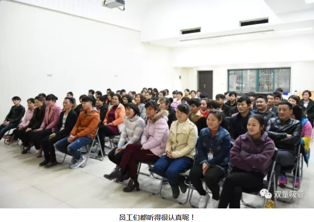 這不,二當(dāng)家李二橋和副總吳小彬在對(duì)新員工們表示了歡迎后,介紹了“雙童”的企業(yè)文化和基本情況。從“雙童”的廠房變遷、發(fā)展歷程等方面詳細(xì)地介紹了“雙童”。這可滿足了新員工們的好奇心,感受到“雙童”這個(gè)大家庭的溫暖,大家工作起來(lái)都動(dòng)力十足了呢!