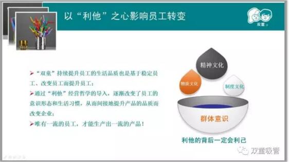 通過員工喜聞樂見的形式,灌輸企業(yè)價值觀,潤物細無聲地將“雙童”的企業(yè)文化落地生根,有聲有色地在企業(yè)全員中開展,并形成"雙童"獨特開放、包容、快樂的企業(yè)文化氛圍,通過文化的作用是讓員工形成自律,從而全面提升員工整體素養(yǎng)!