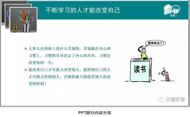 最后,妞也分享道:“無論你在哪里,都不要放棄今天的學(xué)習(xí),學(xué)到的一定是自己的,也會(huì)讓你終身受用,只有不斷地學(xué)習(xí)才能改變自己!” 有的人會(huì)說,學(xué)習(xí)是很枯燥的。但是吸管妞覺得,通過不斷地探索改革,“雙童”的學(xué)習(xí)會(huì),卻越來越熱鬧,越來越快樂……