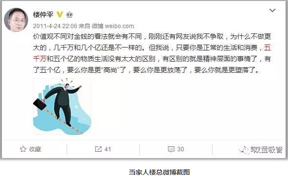 沒錢談不上自由,但有錢也未必自由。原始積累很重要!當家人樓總幾年前發(fā)的一條微博道出了他的看法:價值觀不同對金錢的看法就會有不同,其實只要你是正常的生活和消費,50000000和5個億的物質生活不會有太大的區(qū)別,有區(qū)別就是精神層面的事情了,有了5個億,要么你就更“高尚”了,要么你是更放蕩了,要么你就是更墮落了。