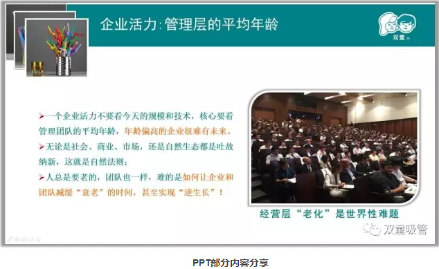 本次樓總的演講主題是《“雙童”團隊的“涅槃重生”—淺談經(jīng)理人團隊如何不被“老化”》課程。企業(yè)經(jīng)理人團隊“老化”是許多傳統(tǒng)企業(yè)存在的問題,其實這種“老化”的本身不在于生理層面的年齡問題,而在于心理層面出現(xiàn)的“老化”問題……下面妞就重點和大家來分享樓總的課程吧!