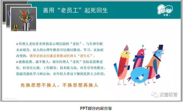 經(jīng)理人老化更多所指是心理層面的“老化”,而人的心理年齡是可以通過推動、學習、認知而改變的,領(lǐng)導者的責任就是要推動經(jīng)理人“逆生長”。“雙童”在每周一和周三的19-21點,舉辦全體員工的學習會,確保所有員工每月有累計8小時的學習和培訓;將員工的學習與職業(yè)升遷掛鉤,讓每個員工不斷學習和認知到新事物。