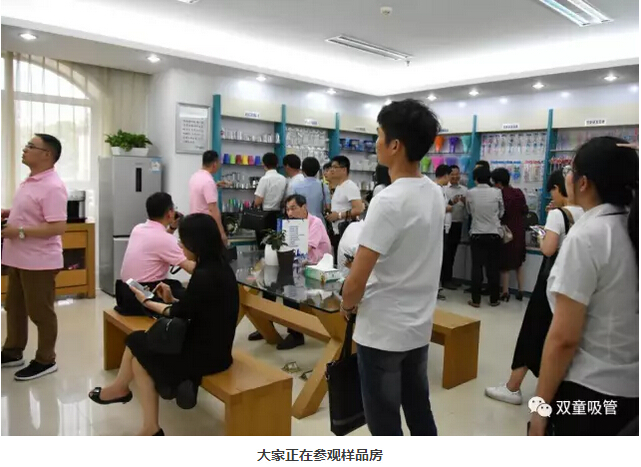 移步樣品房,大家都被琳瑯滿目的各類吸管所吸引,尤其是各類功能情趣的創(chuàng)新吸管,它顛覆了大家腦海里幾分幾厘的普通吸管,而是轉(zhuǎn)變?yōu)閹讐K錢一支的高端產(chǎn)品,更是讓每個人都嘖嘖稱奇,贊嘆“雙童”的創(chuàng)新力之強!
