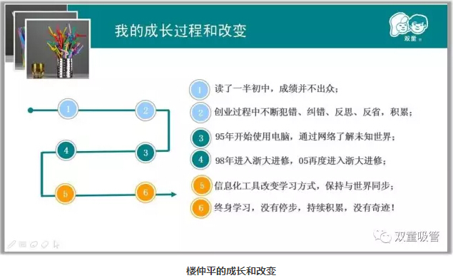 下面吸管妞就和大家來分享樓仲平在兩次課程當中的精彩分享吧!首先,“雙童”樓仲平分享了自己的創(chuàng)業(yè)經(jīng)歷,14歲跟隨父親去江西“雞毛換糖”,在“雞毛換糖”的過程當中勇于創(chuàng)新,持續(xù)折騰。期間做了二十多個行當,經(jīng)過多次失敗后于1994年創(chuàng)辦雙童吸管。