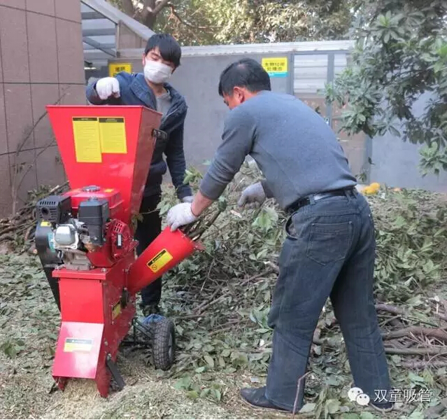 而對園林綠化維護中產生的樹枝枯葉等生物質垃圾,我們則專門購置了一臺木條粉碎機,對生物質垃圾進行粉碎處理。該物四四方方,遍體通紅,上一口,側一口,塞進去的枝葉全都絞碎成粉末,威力可真是大!