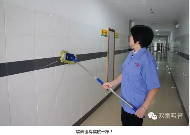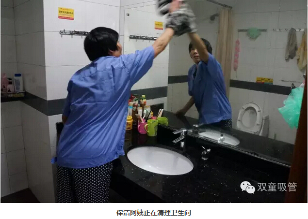 首先吸管妞就從衛(wèi)生保潔工作說(shuō)起,每天清晨,保潔阿姨就已經(jīng)將員工寢室的通道打掃地干干凈凈了。墻面上的每一塊瓷磚都得用布拖把擦拭干凈,不能留下一點(diǎn)灰塵!
