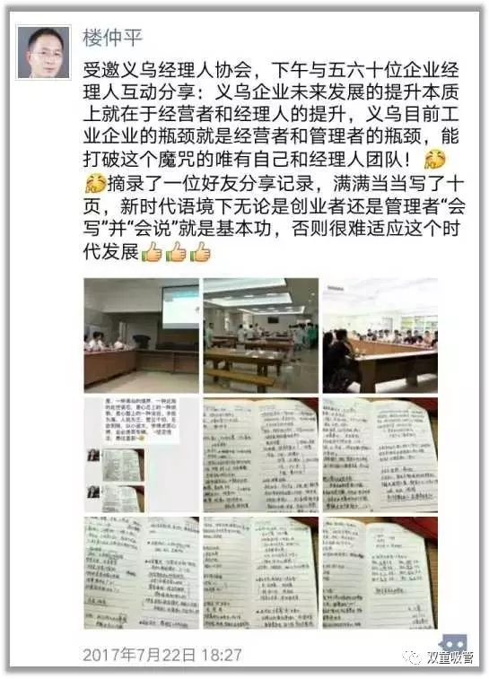 分享到最后,大家都覺(jué)得此次課程分享收獲滿滿,經(jīng)理人們都做了滿滿當(dāng)當(dāng)?shù)墓P記呢!樓仲平也鼓勵(lì)在座的經(jīng)理人們不斷迭代,不斷自我提升,打破企業(yè)經(jīng)營(yíng)魔咒。最后,放上我們的大合照,吸管妞也歡迎大家再來(lái)“雙童”做客哦!