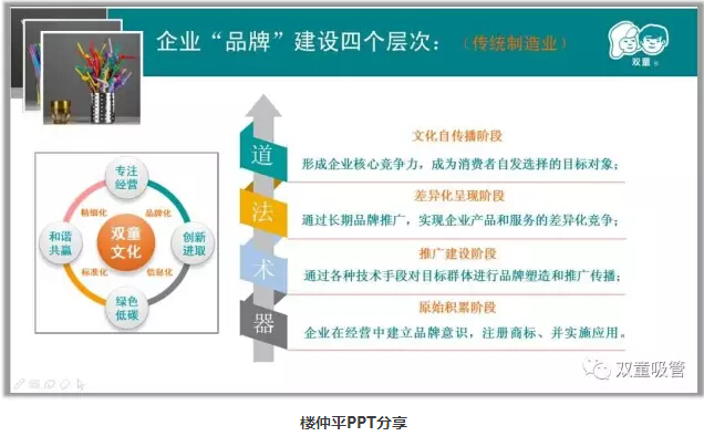 樓仲平分享到最后,通過“雙童”文化傳播樹來呈現(xiàn)“雙童”的品牌推廣和傳播。這顆傳播樹也清晰系統(tǒng)地說明了“雙童”是如何傳播“故事”、塑造品牌的!