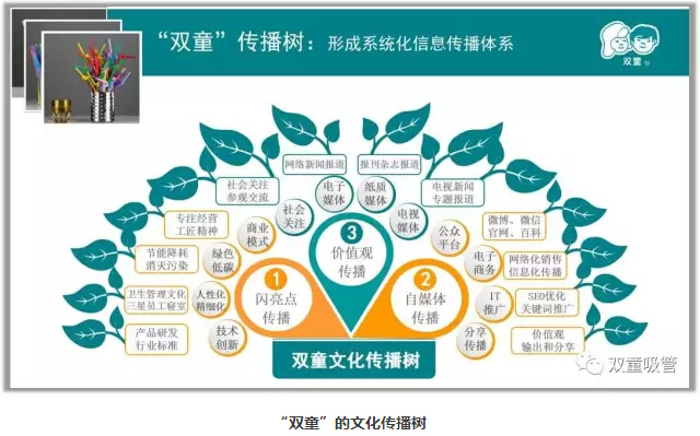 “左邊是閃亮點(diǎn)的傳播介紹,包括了綠色制造、節(jié)能降耗、精細(xì)化管理以及技術(shù)創(chuàng)新等內(nèi)容。右邊通過微博、微信、博客、官網(wǎng)、百科等制造話題,即時(shí)發(fā)布博文、軟文、帖子等內(nèi)容,并進(jìn)行互聯(lián)網(wǎng)、IT推廣、展位推廣等自媒體的傳播。上邊則是政府、媒體關(guān)注的價(jià)值觀傳播。三大部分組成了‘雙童’的文化傳播樹!”