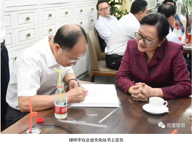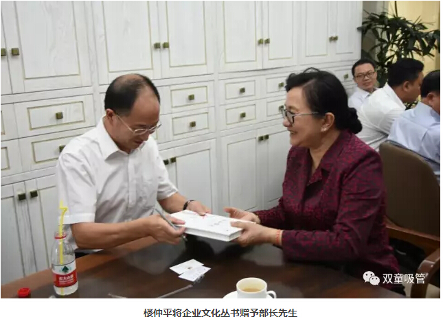 坐下后,看到桌子上的企業(yè)文化叢書,部長先生忍不住翻閱起來,并向樓仲平主動表示:“我太喜歡你們公司的企業(yè)文化了,能送我一本嗎?”她說:“我真是太喜歡‘雙童’了!看到部長先生對“雙童”文化如此感興趣,樓仲平非常希望能夠送她一套企業(yè)文化叢書。部長先生說道:“既然你把書贈予我,當然要幫我在上面簽名。”樓仲平開玩笑道:“自己只上過小學,不太會寫字,都是蓋章的?!辈块L先生大方直言自己也才讀了六年的書,可見要取得如今的成就,部長先生背后付出了多少努力呢!
