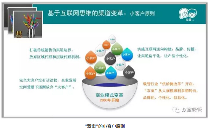 2003年以后,樓仲平受日本友人的影響開始反思原有的商業(yè)模式,實(shí)施了小客戶原則,放棄了眾多跨國(guó)大買家,更側(cè)重于酒吧、夜總會(huì)、KTV、咖啡廳等中高端消費(fèi)的小訂單?,F(xiàn)在,“雙童”的小客戶達(dá)到了12000多家,通過訂單的積累,長(zhǎng)期為企業(yè)創(chuàng)造價(jià)值。